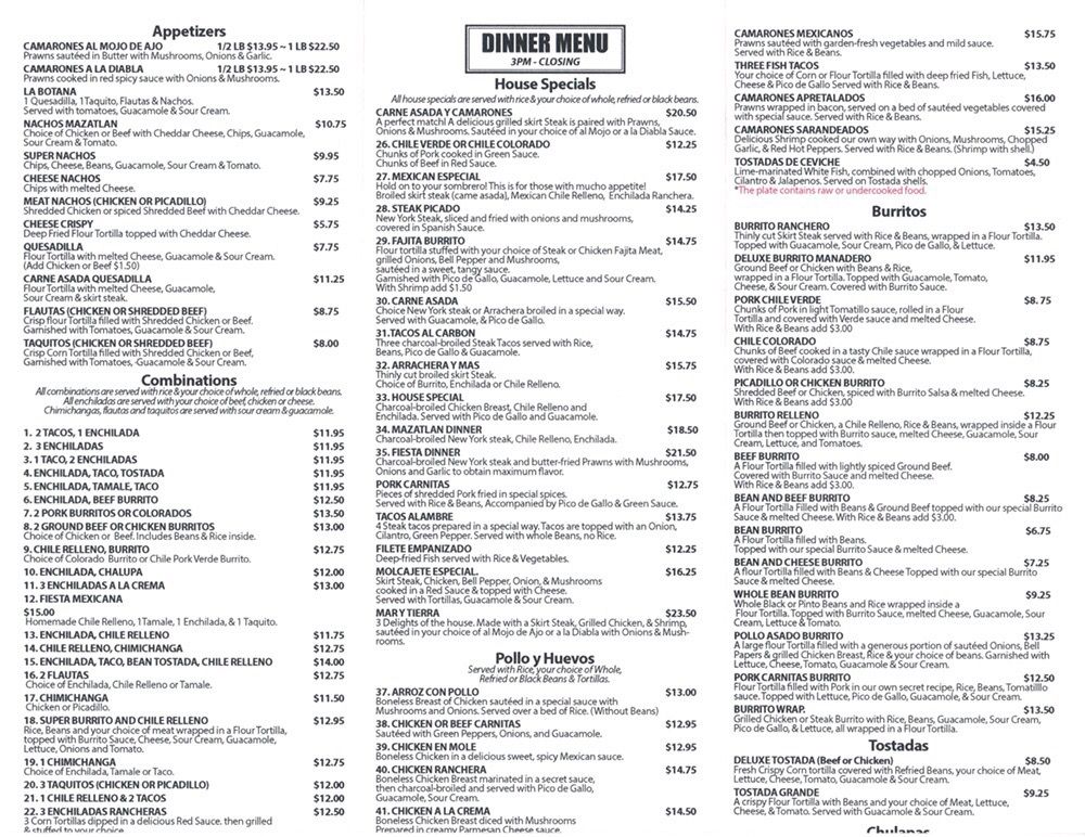 Located in Sherwood, OR, Mazatlan Mexican Restaurant offers a delightful dining experience with a range of Mexican dishes. The menu boasts appetizers like Camarones a la Diabla and flavorful soups like Campechana Soup. For those seeking salads, options like the Shrimp Salad or Taco Salad are sure to satisfy. Customers praise the restaurant for its excellent service and tasty dishes. Reviewers rave about the chipotle chicken plate and the generous portions. With a casual yet classy ambiance and a full bar offering refreshing margaritas, Mazatlan Mexican Restaurant is a top choice for Mexican cuisine in the area. The positive reviews and varied menu options make it a must-visit spot for Mexican food enthusiasts.